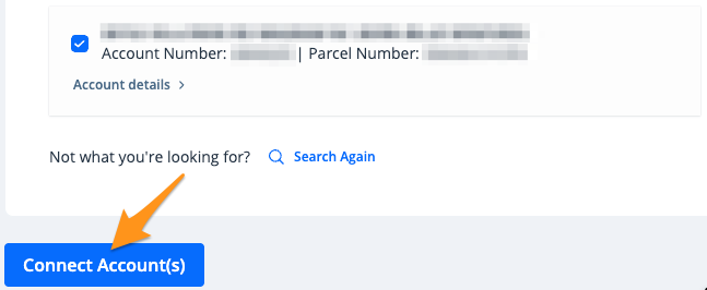 3. The result(s) of your search will be displayed. Confirm this is the correct property and connect it to your profile by clicking Connect Account(s). If something does not look right, click Search Again.