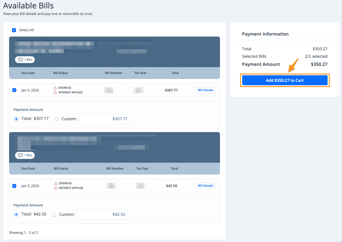 2. Select the preferred bills then click the blue Add $--.-- to Cart button