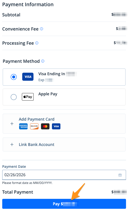 2. After choosing your payment method, select your preferred "Payment Date" then click the blue Pay $--.-- button to schedule your payment